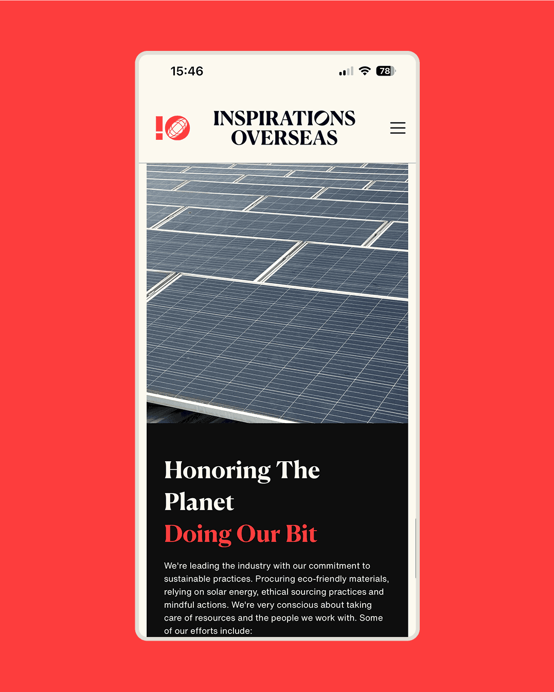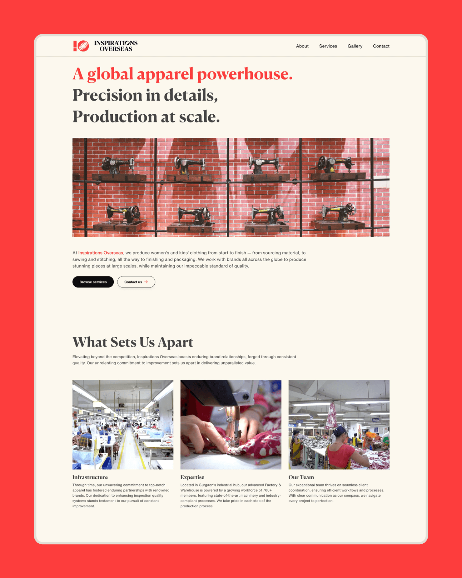 Inspirations Overseas is a garment export house catering to international clients. My role involved developing a professional digital identity that highlighted the company’s manufacturing capabilities, design expertise, and commitment to quality. The site was designed to serve both as a brand showcase and a functional tool for attracting and engaging overseas buyers.
