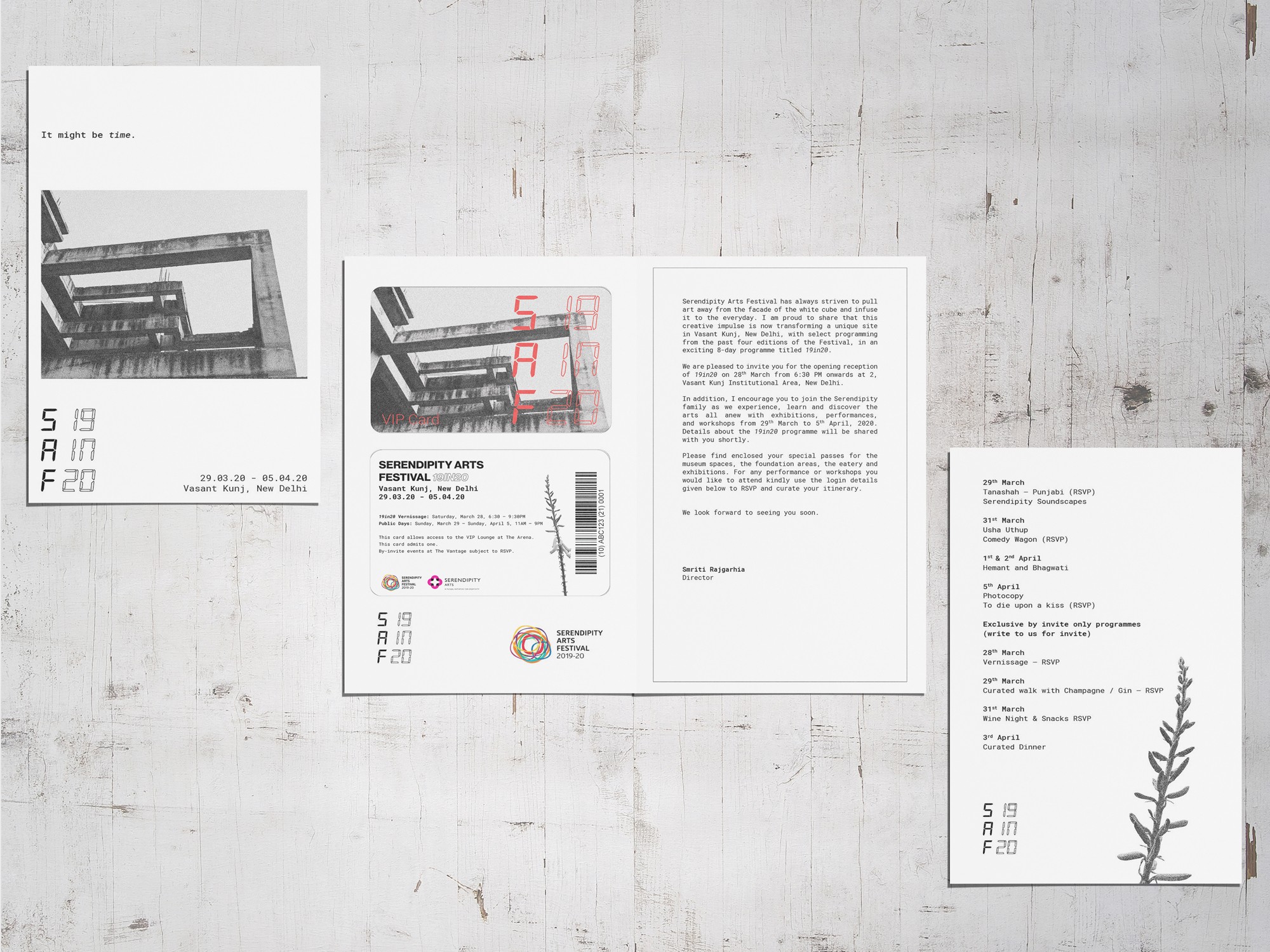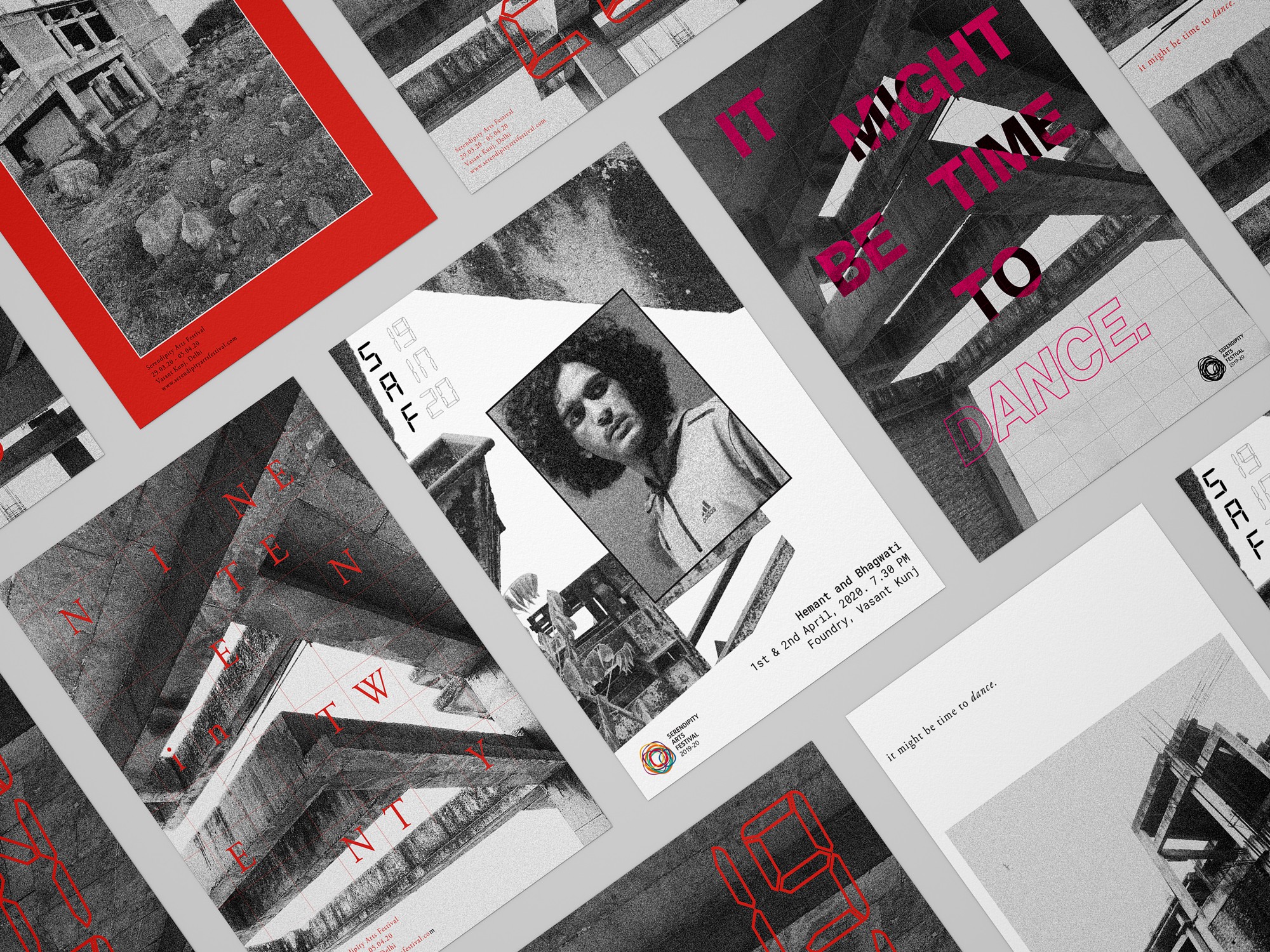 Following four successful editions of the Serendipity Arts Festival in Goa, the Foundation aimed to bring a glimpse of the festival to Delhi, choosing an unfinished construction site as the venue. To reflect the rawness and character of the space, I developed a new design language that diverged from the festival’s usual vibrant aesthetic. Instead, we used neutral tones, concrete-like textures, and a grainy, achromatic palette, with a single vivid accent color to stand out against Delhi’s grey urban landscape. Incorporating visuals from the site itself, the design emphasized themes of time and transformation, using phrases like “it might be time” and “it is time” to express duality and evoke a strong sense of recall.
