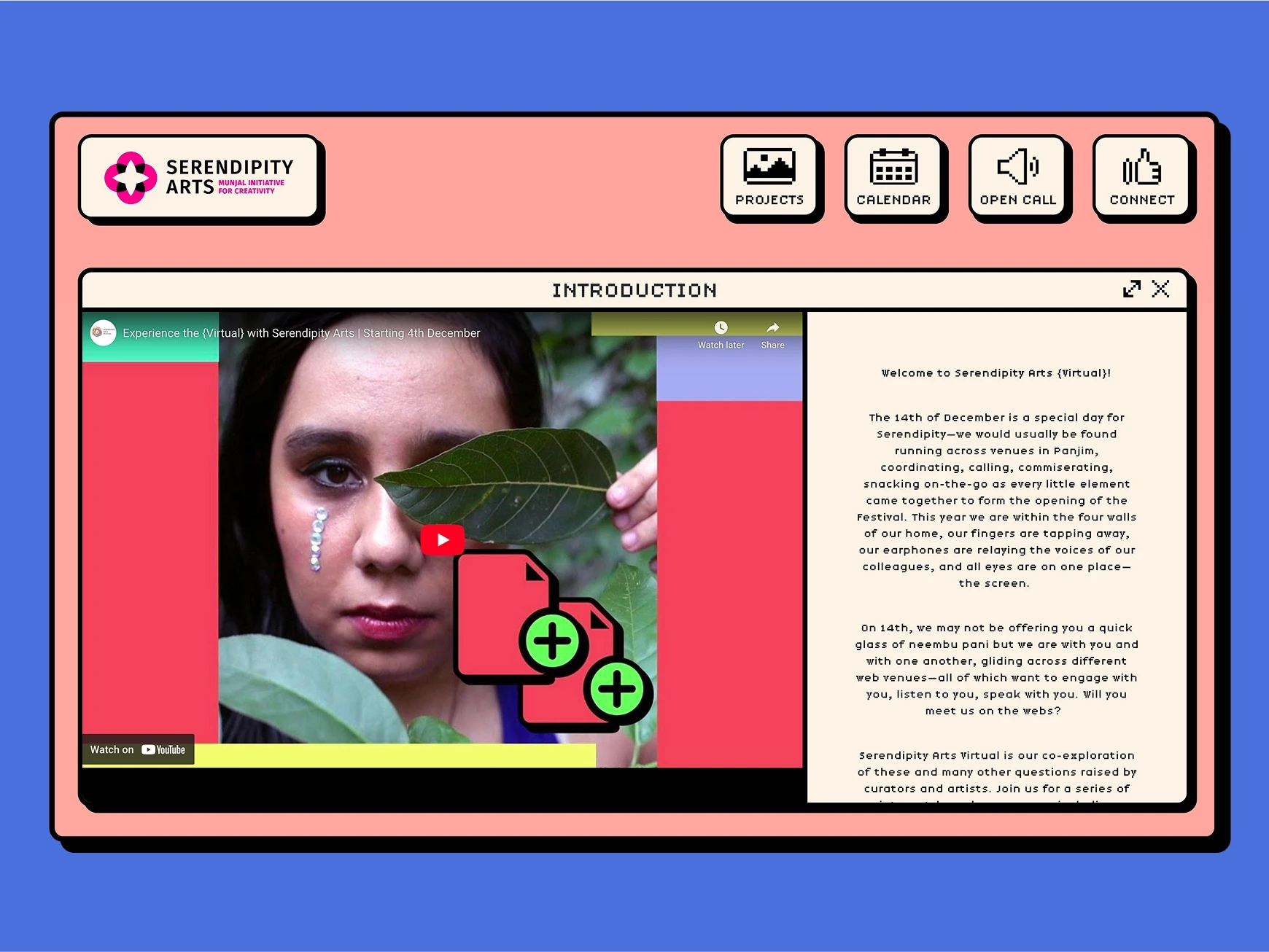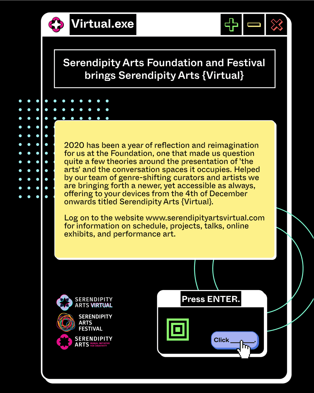 I was tasked with developing the brand identity for the first-ever virtual edition of the Serendipity Arts Festival—Serendipity Arts Virtual. This project was born out of the need to reimagine one of South Asia’s largest interdisciplinary arts festivals in response to the restrictions imposed by the COVID-19 pandemic.